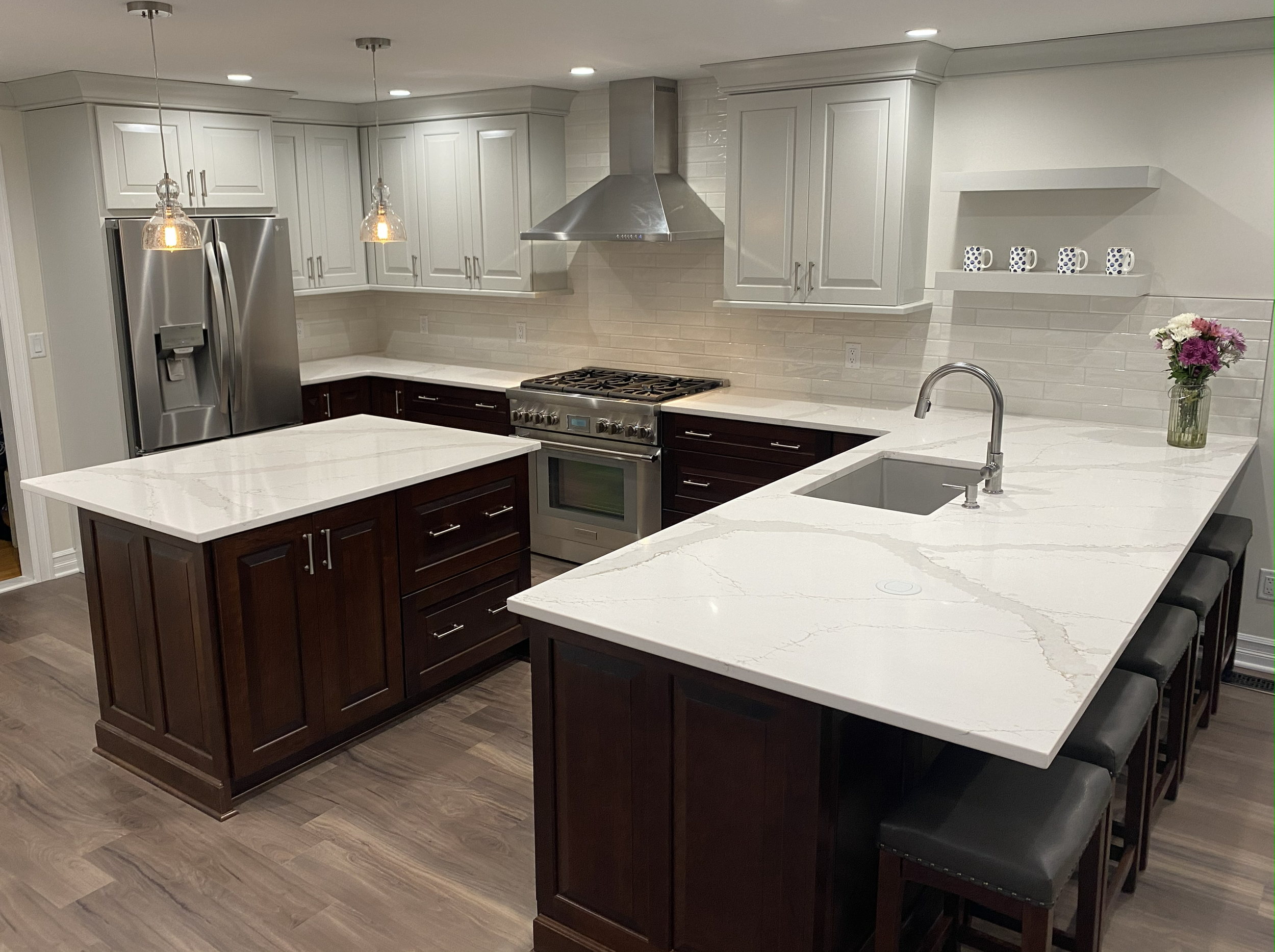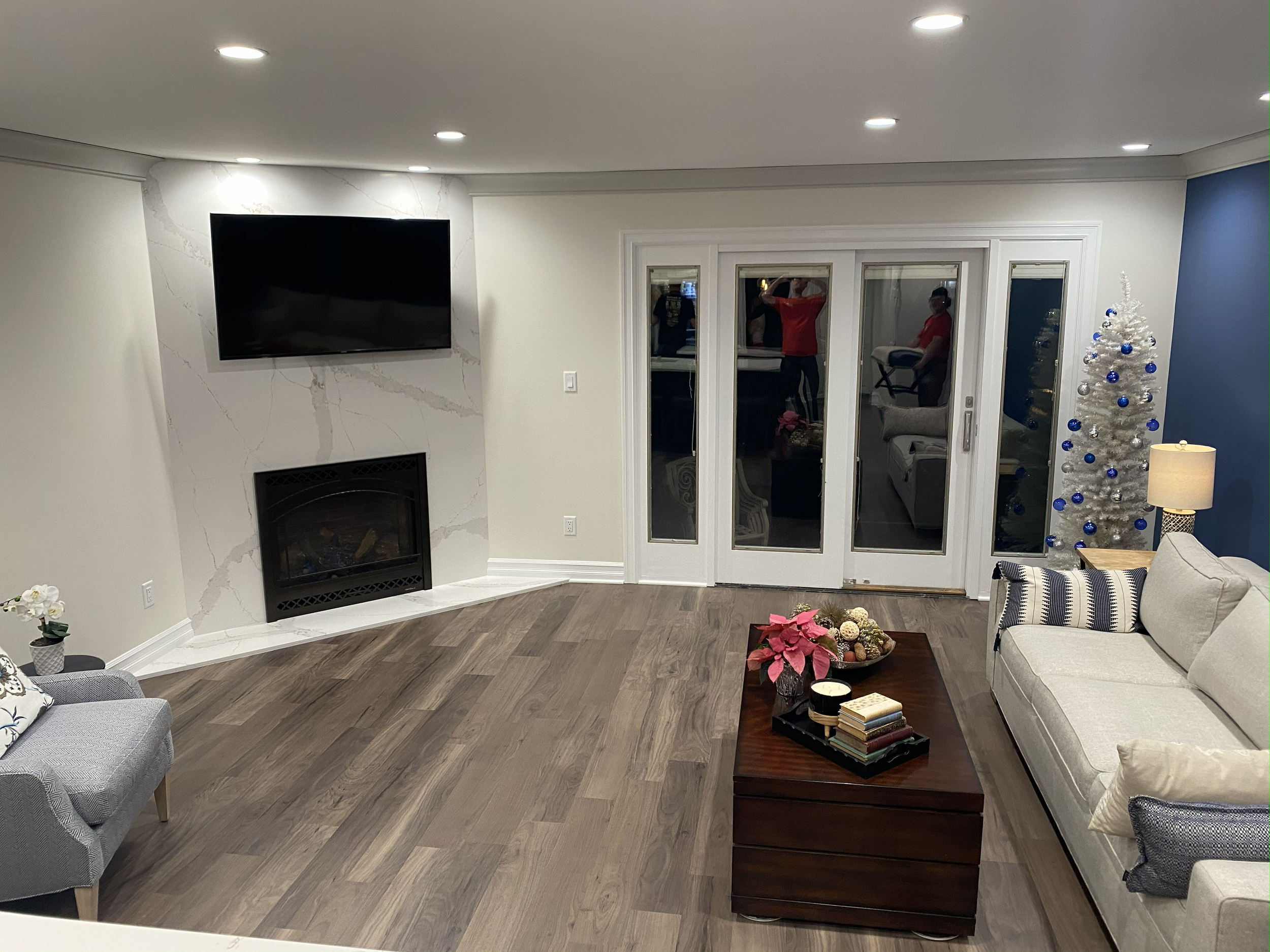 Lustrous Quartz Countertops and a Custom Quartz Fireplace Surround